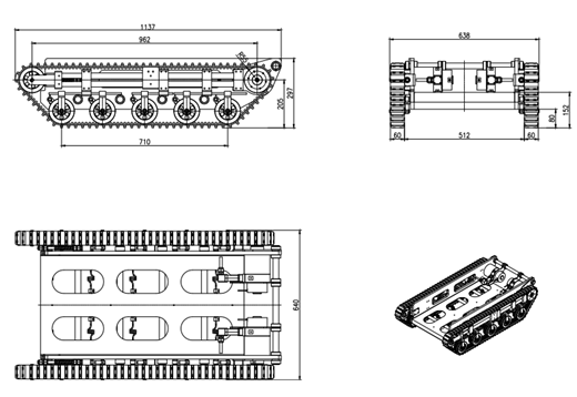 总体最大外围尺寸为1137mm×640mm×297mm(长×宽×高),底盘离地高度80mm,越障能力为200mm。履带带宽60mm, 一款水下全地形履带底盘。