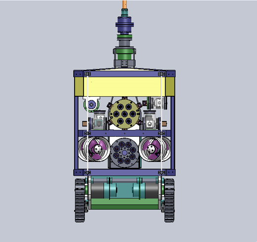 本结构有效分配空间,降低了驱动重心,增加了越障能力,实现最小重量提供最大越障水平是ROV的最大优点。